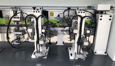 6輪壓貼貼合比4輪更精密,膠線輕微不跑帶,貼合牢靠,厚薄木皮均可輕松走帶,氣缸控制開關(guān)膠門,膠量穩(wěn)定,厚薄均勻。
