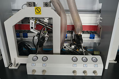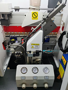 切斷板材兩頭的多余封邊帶(氣缸帶2個(gè)調(diào)壓閥1個(gè)泄壓閥)氣壓更穩(wěn)定,齊頭齊尾更穩(wěn)定.