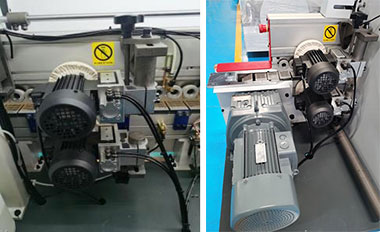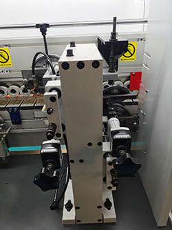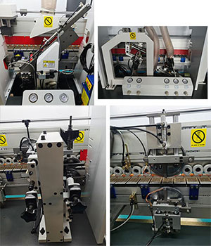 6輪壓貼貼合比4輪更精密,膠線輕微不跑帶,貼合牢靠,厚薄木皮均可輕松走帶,氣缸控制開關(guān)膠門,膠量穩(wěn)定,厚薄均勻。